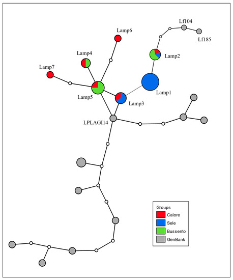 The relationships among haplotypes are represented in the TCS network (Figure 2). The haplotypes Lamp3 and Lamp4 were linked to the central haplotype Lamp5 by one mutational step, while the two haplotypes Lamp6 and Lamp7, private in the Calore River, are both separated by two mutational steps (Figure 2). In general, the observed Italian haplotypes are in a star-like structure around haplotype Lamp5 and grouping separately from Genbank haplotypes, where haplotype LPLAGI14 [26] acts as a link. The haplotypes displaying the 39 bp indel (Lamp1 and Lamp2) were connected to haplotype Lamp3 by one and two mutational steps, respectively, and three mutational steps separated them from the other haplotypes selected by the BLAST technique in Genbank (Figure 2).
