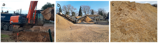 The soil was excavated after removing vegetative soil. Typically, the excavated soil comes from suburban areas and covers soils to an average depth of 1 m. The soil samples were taken from excavated soil deposits belonging to the Gendrot public works company but are representative of regularly stored soil from various regional construction projects. Sampling sites are Bourg de Compte (BDC) and Cesson Redwood (Cesson) storage site and the Calma earthwork site. Excavated soil from the BDC and Cesson sites is crushed and sieved into a fraction of 0/4 mm with a crush/sieve system. Soil excavation from a site is shown in Figure 1a. Figure 1b shows the crushing/sieving of soil, and Figure 1c shows the extracted soil stockpile.