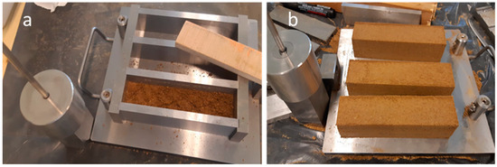 The soil mixture was prepared with the addition of optimum moisture content and molded into prismatic specimens of 4 × 4 × 16 cm3 for flexural and compressive strength tests based on French standards for mortars [38]. A total of 450 g of soil was mixed with optimum moisture content, which is commonly used to mix soils to achieve maximum densification through compaction [39,40]. Prismatic molds were oiled to decrease the adhesion of soil to molds. The soil mixture was filled into molds in two layers [41] and compacted with dynamic loading by applying Proctor normal energy of 600 kN.m/m3 with repeated strokes of falling mass. With dynamic compaction of bricks, it is easier to control compaction energy—it is one of the efficient techniques to remove the voids and increase the strength of bricks [42,43]. After compaction of the first layer of soil, groves were made on the first layer of soil to make it rough and increase bonding between the two layers. Strong bonding between layers increases the strength of earth bricks. The bonding of layers in the case of mortar specified in the standards is different from the cement paste which when poured in the mold is homogenized and has no problem with adhesion. Compaction tools and groves on the soil layer can be seen in Figure 2a. Excessive soil on the brick surface after compaction was trimmed to maintain a height of 4 cm. Compacted bricks were unmolded and dried at a low temperature in the oven at 40 °C to rest near the natural drying temperature. Demolded compressed earth blocks can be seen in Figure 2b.