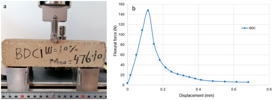 The mechanical behavior of earth blocks was investigated with flexural and compressive strength tests. The flexural strength of earth bricks (indirect tensile strength) was determined with a three-point bending test [44] using a Shimadzu AGS-X model machine with a 50 kN sensor at a displacement rate of 0.5 mm/min. Figure 3 shows the flexural strength testing of compressed earth blocks with the BDC soil sample along with the flexural load-deflection curve. The flexural load was applied perpendicular to the layer interface of earth bricks. During the flexural loading in Figure 3a, cracks started from the bottom of the brick and propagated slowly upward before failure. Figure 3b shows that unreinforced bricks do not support the load after failure as they have very little toughness.