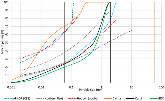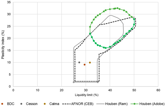 Granulometry of soil shows that BDC and Cesson soils have higher sand content while Calma soil has higher clay content. According to the USDA soil classification system [45], BDC and Cesson soils are sandy loam while Calma is clayey soil. The grading coefficient of Calma soils is between 1 and 3, which means that this soil is well graded while the other soils are poorly graded [46]. Soils with a higher percentage of fine particles usually have higher plasticity. Significant clay quantity is essential in bricks to ensure the plasticity and bonding of soil particles. However, excessive clay leads to shrinkage, cracks, and expansion of earth blocks in their interaction with water. The suitability of the Brittany region soils for earth bricks with granulometry in accordance with the French standard [47] and recommendations of Houben and Guillaud [48] is shown in Figure 5.