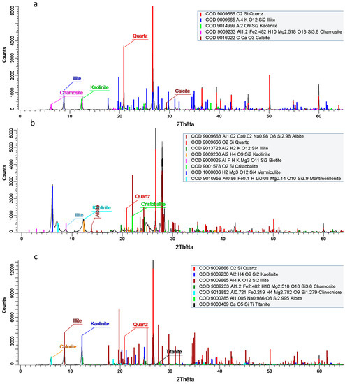 Calma soils have a high percentage of clay minerals. The clay and sand content of soils determined with laser granulometry and XRD are consistent. However, for BDC soils, sand content was overestimated by laser granulometry. Quantitative analysis with the XRD test provides a more comprehensive picture of soil mineralogy and the percentage of clay minerals. An important clay mineral identified in soil samples is illite along with chlorites (chamosite and clinochlore). Illite clay is good for shaping and drying bricks. Illite and chlorite clays demonstrate small volumetric changes in their interaction with water contrary to montmorillonite and smectite clays, which have very good cohesion and a tendency to swell during their interaction with water. Swelling and shrinkage of bricks on wetting and drying lead to crack growth, which is undesirable for construction materials [39,53]. Quartz (SiO2) and feldspar minerals are other major minerals in soil samples, and these are the most common mineral in the earth’s crust. The presence of calcite is negligible in Calma and Cesson soils while its percentage is 4.1% in BDC soils. Calcium carbonate acts as a cementing agent in soils by increasing their compressive and shear strength [54].