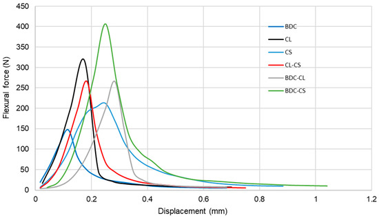 The flexural strength of earth bricks was determined with a 3-point bending test. The results relating to deflection under a vertical load (4 × 4 × 16 cm3 test) could be used to define the load-bearing capacity limitation as compressive testing. However, other tests, such as pushover tests, could be carried out on walls built with this type of bricks [60]. Flexural load-deflection curves of soil samples are shown in Figure 8.