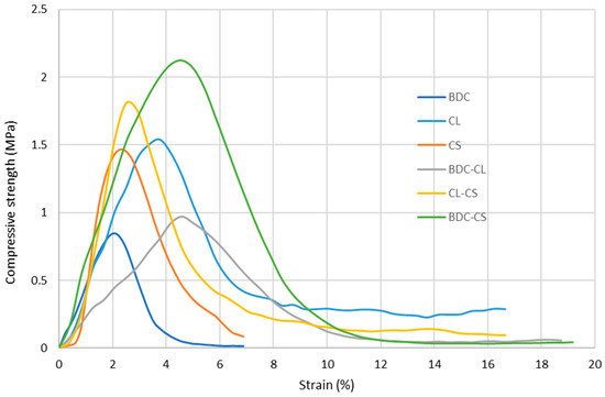 The compressive strength of earth bricks was determined on cubes of earth bricks with dimensions of 4 × 4 × 4 cm3 obtained after the flexural strength test. Compressive strength load-deflection curves are shown in Figure 9.