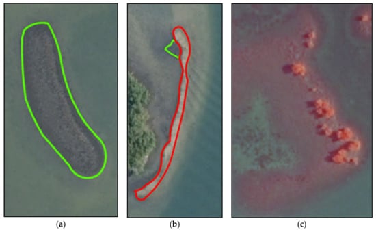 (a) Digitized live reef; (b) Digitized dead reef (red outline) with small live area (green outline); (c) Juvenile mangroves growing on live reef visible using CIR imagery.