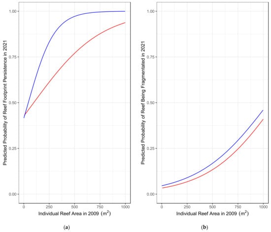 Probability curves predicted using binomial GLMs. The blue line represents reefs located away from primary boating channels, and the red line represents reefs located along primary boating channels. (a) Probability of a reef being fragmented in 2021 based on its area in 2009 and whether it is located along a primary boating channel (b) Probability of a reef having an identifiable footprint in 2021 based on its area in 2009 and whether it is located along a primary boating channel. (a) Red = Exposed to Primary Boating Channel. (b) Blue = Not Exposed to Primary Boating Channel.