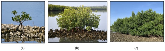 Another factor potentially contributing to the loss of total reef area was widespread mangrove expansion (Rhizophora mangle, Avicenna germinans) onto C. virginica reefs [,,]. Because we found a few C. virginica clusters growing underneath continuous mangrove stands (Figure 5c), this study chose to focus on isolated mangroves with non-continuous canopies as a proxy for future expansion (Figure 5c). Throughout Mosquito Lagoon, 16.8% of live reefs had one or more isolated mangroves growing on them in 2021, indicating that there may be almost 600 reefs in the early stages of mangrove expansion (Table 1). Mangrove expansion begins when a mangrove takes root in a reef. As it grows, it traps sediment and buries the reef below. Eventually, it may cover the entire footprint of the reef (Figure 5). McClenachan et al. [] reported a 103% increase in mangrove cover on C. virginica reefs in Mosquito Lagoon between 1943 and 2017.