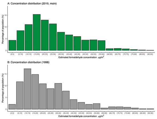The estimated distribution of the percentage of the population in England exposed to annual average residential formaldehyde concentrations (μg/m3) in 2019 (plot (A)) and 1998 (plot (B)).