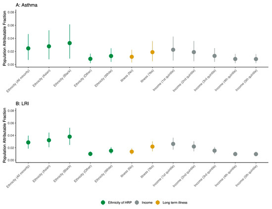 Population Attributable Fractions for asthma (plot (A)) and lower respiratory infections (LRI) (plot (B)) among adults associated with damp and/or mould in English residences (2019). Legend: HRP: Household reference person; LRI: Lower respiratory infections; PAF: Population Attributable Fraction.