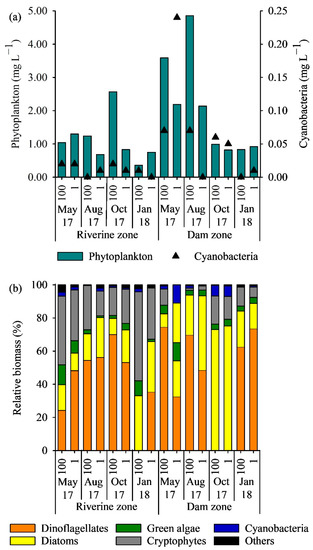 Cyanobacteria were commonly occurring in the Lobo reservoir, but they did not make up the dominant phytoplankton group (Figure 2a). Dinoflagellates and cryptophytes were the most abundant groups of phytoplankton, followed by diatoms and green algae (Figure 2b). The highest biomass of cyanobacteria was observed in May 2017 in the dam zone (0.24 mg L−1), corresponding to 12% of the total phytoplankton biomass. At the other sampling times, cyanobacteria made up less than 7% of the biomass (Figure 2b). Phytoplankton taxa identified in the reservoir by microscopy are listed in Table S4.