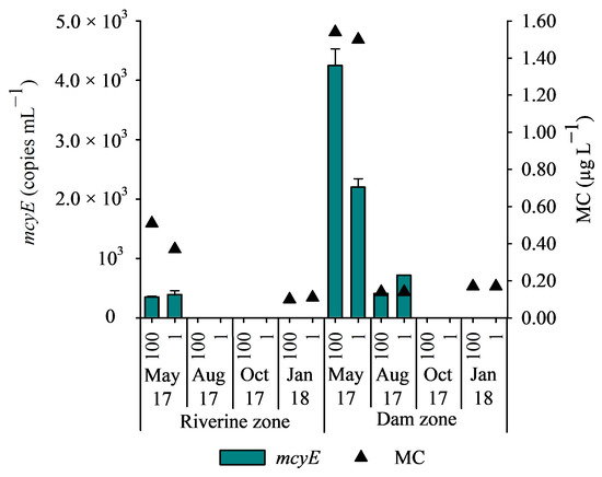 The qPCR assay confirmed the presence of mcyE genotypes in the Lobo reservoir in May 2017 (riverine and dam zones) and in August 2017 (dam zone only). The number of the mcyE gene ranged from undetectable to 4.25 × 103 copies mL−1 and total MC concentrations ranged from undetectable to 1.54 µg L−1 (Figure 4) and correlated positively with the mcyE gene (rho = 0.75, p < 0.001) (Table 1). Microcystin concentrations in the Lobo reservoir were positively correlated with the biomass of Phormidium sp. (rho = 0.66, p = 0.005). Although no correlations between concentrations of MC and biomass of the potential MC producers Aphanocapsa spp., Chroococcus spp., M. protocystis, Pseudanabaena spp., and S. aquatilis were observed, the possibility that these cyanobacteria were also producing MC in the Lobo reservoir should not be ruled out since they were present in the reservoir when MC was detected.