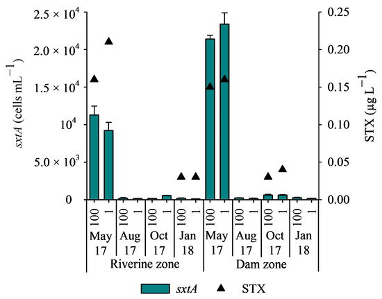 The sxtA gene was detected by qPCR in all samples but showed a temporal variation in abundance (p = 0.017). The number of copies of the sxtA gene in the reservoir during the studied period ranged from 8.79 × 101 to 2.34 × 104 copies mL−1. The highest and lowest numbers were measured in May 2017 in the dam zone and in January 2018 in the riverine zone, respectively (Figure 5). Saxitoxin (STX) concentrations varied significantly between months (p = 0.022). When STX was detected in the water, the concentrations varied between 0.03 and 0.21 µg L−1 (Figure 5) and correlated positively with the sxtA gene abundance (rho = 0.74, p < 0.001) (Table 1). The presence of STX correlated positively with the biomasses of Phormidium sp. (rho = 0.64, p = 0.008) and R. raciborskii (rho = 0.58, p = 0.02). No correlations were observed between concentrations of STX and biomasses of A. gracile and G. amphibium, but it cannot be excluded that these potential STX producers were also responsible for the saxitoxin production in the reservoir.