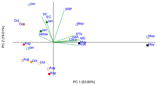 The correlation analyses in Table 1 indicated that different variables influenced the abundance of the mcyE and sxtA genotypes as well as concentrations of MC and STX. MC concentrations and mcyE gene numbers were positively correlated with chl a but negatively correlated with nitrite. The mcyE gene number was negatively correlated with EC and TP. STX concentrations and sxtA gene numbers were positively correlated with cyanobacterial biomass. STX concentrations were also positively correlated with soluble reactive P, while the sxtA gene was negatively correlated with nitrite.