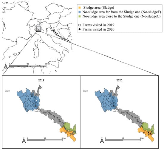 Map of the three sampling sites located south-east of Milan (northern Italy), close to the Adda Sud Park (dark grey area). Orange indicates the Sludge area (Sludge), blue the No-sludge area far from the Sludge one (No-sludge F), green the No-sludge area close to the Sludge one (No-sludge C). Open squares denote farms visited in 2019, while circles denote farms visited in 2020.