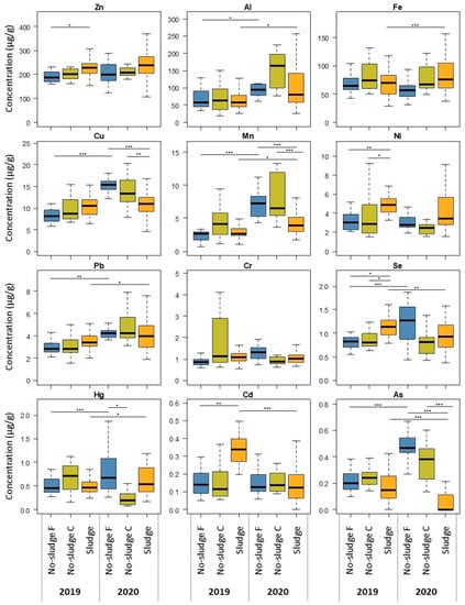 Trace element concentrations in nestling feathers grown in the three considered areas in 2019 and 2020. Orange box plots represent feathers grown in the Sludge area (Sludge), blue box plots represent feathers grown in the No-sludge area far from the area amended with sewage sludge (No-sludge F), green box plots represent feathers grown in the No-sludge area close to the area amended with sewage sludge (No-sludge C). Statistically significant differences between groups of colonies are indicated by lines with asterisks (* = p < 0.05, ** = p < 0.01, *** = p < 0.001). Contaminants are presented in decreasing mean concentration order. Full details of post hoc tests are provided in Supplementary Table S2.