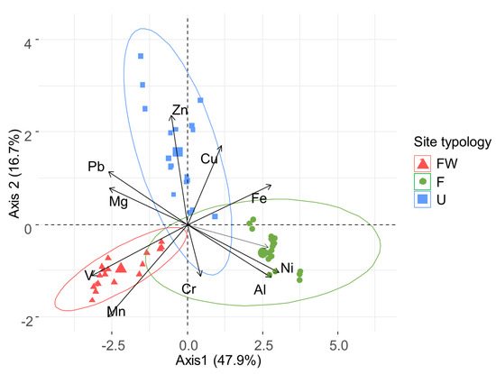 According to ANOVA, the concentrations of the metals statistically varied among soils collected at different sites. In detail, the concentration of Al, Pb and Zn was significantly higher in U than F and WF (Table 1); the concentrations of V, Mn and Ni were significantly higher in F and WF than in U (Table 1); and finally, the concentrations of Cr, Cu, Fe and Mg were significantly higher in F than in U and WF (Table 1).