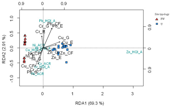 Principal component analysis (PCA) was carried out on the dataset of the soil metal concentrations to evaluate the site distributions, and the confidence ellipses (for α = 0.05) for the land uses were superimposed to PCA (addEllipses function). In addition, permutational multivariate analysis of variance was used to evaluate the significance of the distance matrices (ADONIS, Montreal, QC, Canada). Redundancy analysis (RDA) was performed to assess the impact of soil contamination indices (CF, E and GI), considered as independent variables, on human health risk indices calculated for adults (HQI_A and ACR), considered as dependent variables, calculated for FW and U soils. Due to the high correlation between human health risk indices calculated for children and adults, only the latter were considered for RDA. Forward selection (Ordistep function) of all the investigated independent variables was performed to select those that significantly affected the dependent variables.