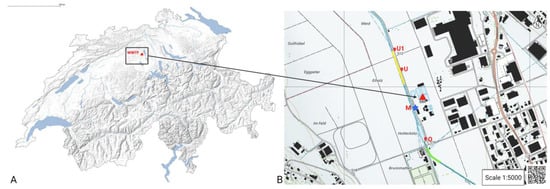 (A) Map of Switzerland with location of the wastewater treatment plant marked as a red triangle. WWTP Coordinates: 47.2613388N, 8.171099E. (B) Location of sampling sites and temperature loggers along the river Wyna in canton of Aargau, Switzerland (© swisstopo). In bright green, the river segment that was fished upstream WWTP and where habitat quality measurement was performed. In yellow, the river segment fished downstream of the WWTP and where habitat quality measurement was performed. Red circle O: location of temperature logger 187 m upstream of the WWTP and eDNA sampling (2655437/1234702). Red circle M: location of temperature logger at the effluent and eDNA sampling (2655383/1234869). Red circle U: location of temperature logger 212 m downstream of the effluent and eDNA sampling (2655308/1235077). Red circle U1: location of temperature logger 500 m downstream of the effluent (2655272/1235181). Also included is the location of the wastewater treatment plant (WWTP, red triangle) and its effluent (blue-filled star). The coordinates of the segment upstream are 47.263020 N, 8.170012 E to 47.259923 N, 8.172160 E (102 m length), and the coordinates of the downstream are from 47.264247 N, 8.169385 E to 47.265842 N, 8.168600 E (122 m length).