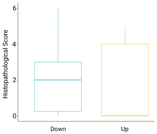 Boxplot of Histopathological scores of Proliferative Kidney Lesions for brown trout (Salmo trutta, Linnaeus 1758) kidney samples from up- (yellow) and downstream (blue) locations of the WWTP in the River Wyna, Switzerland, 2021. Range of pathological lesions from 0 to 6, in ascending order of severity. Sample sizes were downstream n = 14 and upstream n = 5, with three upstream fish showing no pathological changes (0) and downstream fish scores ranging from 0 to 6, with the majority of fish having a score of 2.
