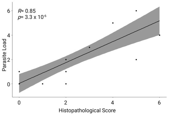 Scatter plot of the Pearson’s correlation of parasite load and histopathological score of all sampled fish. The R score was close to 1, and the p-value < 0.05, which means that there is a significant correlation between these two variables.