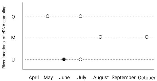 eDNA results of parasitic DNA in the water at the three river locations during the sampling period. Spheres represent samples that were positive for T. bryosalmonae in eDNA samples in the qPCR for T. bryosalmonae. White spheres are those where one technical replicate was positive. The black sphere is one water sample where all qPCR technical replicates were positive. In total, we detected parasitic eDNA during this period two times in each location. Abbreviations: O—187 m upstream effluent; M—at the effluent; U—212 m downstream the effluent.