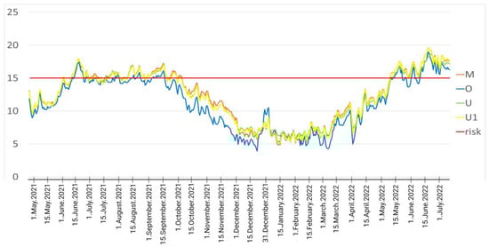 In our case scenario, the Mann–Whitney–Wilcoxon test resulted in statistical significance between the logger upstream (O) vs. the other three (M, U and U1) and with no statistical difference between the temperatures measured in all loggers from the effluent downstream (M, U and U1) (Table 6). The average temperature of each day differs by almost 1 °C between up- and downstream sites, and this difference represents a strong biological risk because this 1 °C difference occurs exactly between 14 °C and 15 °C water temperature (the risk temperature for PKD).