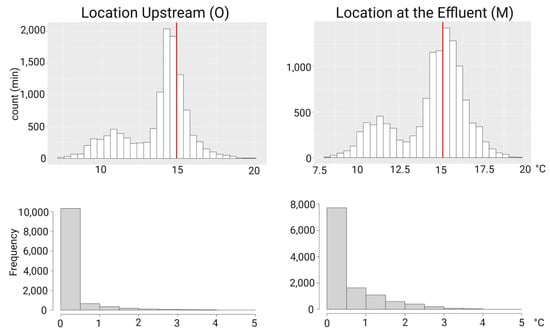 Histograms showing the temperature distribution in minutes (top) and frequency (bottom) in upstream location (O) and at the effluent (M). Temperature was logged every 15 min, and histograms on the top show the count of the 15-min intervals. Upstream, the majority of the measured temperatures lies below 15 °C, whereas at the effluent, the majority lies above the PKD risk temperature of 15 °C. The red line represents the risk temperature of 15 °C for Proliferative Kidney Disease. The lower histograms depict the frequency of temperatures exceeding 15 °C within 0.5 °C intervals. Abbreviations: min—minutes; O—logger upstream; M—logger at the effluent.