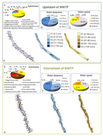 Analysis of habitat quality and diversity in river segments up- and downstream of the WWTP effluent with IAM method [,]. (A–D) Segment upstream. (A) Percentage of the different substrates present in the segment upstream. The vast majority of the segment is covered by clogged stones (71% of the surface) and 9% of big stones, so 80% of the segment is composed of unattractive substrates for fish. Attractive substrates like bankside vegetation, deadwood and washed-out banks are not more than 4% of the segment. (B) Water depth had a moderate variability, with 4 different water depth classes being present; the majority of the segment surface had depths of 6 to 70 cm. A very low percentage of 4% had deeper parts of more than 70 cm, which are suitable for adult fish. (C) Water speed was overall low, and only three speed categories were present, with the majority of the segment (63%) showing speeds of 0 to 10 cm/s and the rest of the segment up to 80 cm/s. Fast-flowing sections were missing, which would be suitable for strong swimming fish. (D) Mapping of the substrate, flow and depth layers in the upper section of the river. (E–H) Segment downstream. (E) Percentage of the different substrates in downstream segment is represented. The variability of substrates is high; the quantity of attractive ones is low to moderate but still higher than the upstream segment. More than 50% is covered by clogged stones and big clogged stone blocks, both unattractive substrates for fish. Presence of bankside vegetation (11%) and deadwood (7%) and washed-out banks (4%) increases the attractivity of this segment compared to upstream. (F) Water depth classes are only three, with low water depths of up to 70 cm. Deeper parts are completely missing. (G) Water speed also only included three classes upstream; they were more or less equally distributed between low and moderate. Again, fast-flowing sections were missing, which would be suitable for strong swimming fish. (H) Mapping of the substrate, flow and depth layers in the downstream section of the river.