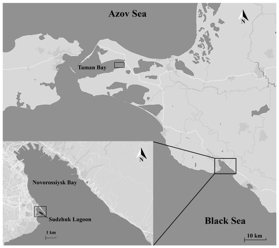 The study is based on 87 geobotanical descriptions («relevés») of charophytes-dominated communities performed in the sublittoral zone of the North Caucasus shelf of the Black Sea. The study was performed at two points where charophytes are known to grow—the Sudzhuk Lagoon of the Novorossiysk Bay and Taman Bay (Figure 1) in 2009–2020. A map of the sampling sites was made with Google Maps [15]. Salinity was measured at each site using a calibrated hand-held refractometer with automatic temperature compensation (Euromex, Arnhem/NL). Communities were described on sites from 0.25 to 1.0 m2 and a depth from 0 m to 2 m. The algae were determined mainly during the description of communities, and the refinement of the taxonomic identity of some species was carried out in the laboratory. Identification was based on typical morphological characters using identification keys [16,17]. Some species of Ulva could not be identified confidently and were marked as Ulva sp. Nomenclature is given according to AlgaeBase [18]. Saprobity of the species is given according to [14,19]. Lists of macroalgal species with an indication of their phytogeographic characteristics were used for phytogeographical analysis of the communities [19,20,21].