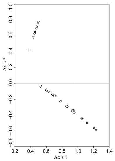 - ter Braak, C.J.F.; Šmilauer, P. CANOCO Reference Manual and CanoDraw for Windows User’s Guide: Software for Canonical Community Ordination (Version 4.5); Micro-Computer Power: Ithaca, NY, USA, 2002; 500p. [Google Scholar]