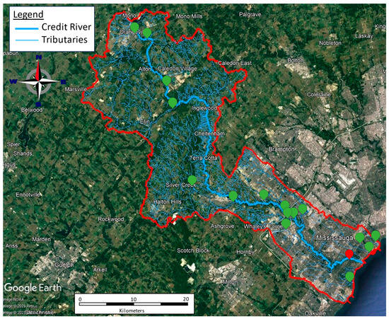 The Credit River is located in Southern Ontario, Canada, just west of Toronto. Its source is located in Orangeville, and the rivers flows until reaching Lake Ontario in a 90 km trajectory [30,31]. The Credit River has a total drainage area of 93,000 ha, and its land composition is split as follows: 35% for agriculture, 27% for urban use, and the remaining 38% comprises natural habitats. The area has an estimated population of 1 million people [32,33,34]. The river is important for environmental conservation due to its rich aquatic biodiversity and its role as a vital water source for the local population [30,35]. A map showcasing the location of the Credit River watershed and its tributaries is presented in Figure 1, where the red mark represents the reference station, i.e., where the chloride concentration is being forecasted, namely “Credit River @ MGCC”, while the green marks show the location of the neighboring stations that provide spatiotemporal data.