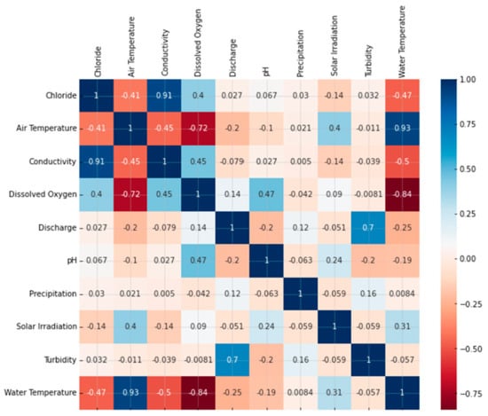 The dataset used for this study contains historical data concerning the Credit River from 2016 to 2020. The historical data have a time resolution of 15 min. With the exception of precipitation (which was summed), all the variables were resampled to 1 h intervals to calculate the average value for each one of them before being fed to the assessed models. The stations distributed along the river’s course measure values for the water’s physical-chemical characteristics and weather attributes. Figure 2 shows the correlation between each attribute in matrix form.