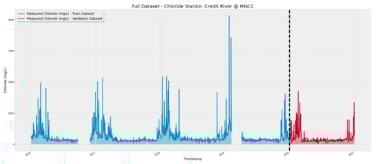 Many municipalities have installed real-time water quality monitoring stations to accurately assess the environmental impacts of winter road maintenance and reduce road salt application in salt-vulnerable areas. The implementation of low-impact development with the physical modeling of enhanced roadside drainage systems was proposed in previous work as a viable approach to manage chloride concentration for salt-vulnerable areas [18,19]. However, due to the large quantity of data collected at a high frequency, real-time monitoring stations’ data are most efficiently analyzed by advanced deep learning models, providing accurate water quality forecasts. When compared to physical-based forecasting models, the data-driven paradigm, such as machine learning (ML) and deep learning (DL) approaches, have been favored by scientists due to their simpler implementation, faster processing times, and inherent capacity to identify complex relationships in the data [20,21,22,23].