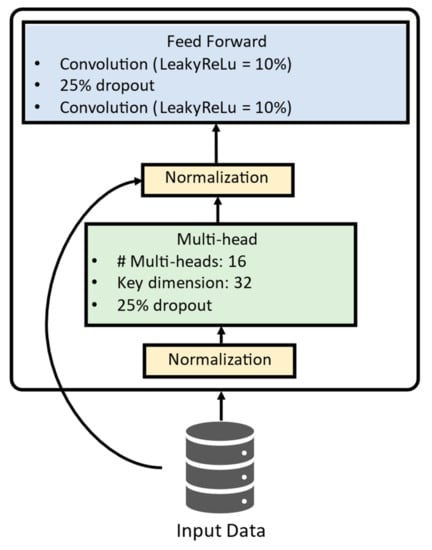 In the original Transformer structure [44], the encoder embeds data to a context vector using positional encoding and stacks a multi-head attention mechanism, determining how the provided input attends to each other. The encoder output is then fed to the decoder, which generates the most probable forthcoming word for NLP applications [44]. Transformer-based models have exhibited superior or comparative performance during comparisons with recurrent neural networks when applied to different areas, such as speech recognition [45], computer vision [46,47], and time series forecasting [48].