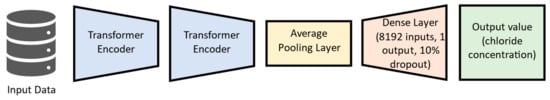 Figure 4 shows that the transformer uses just the encoder structure for the present study. There, the input data are normalized before being fed to the multi-head structure, which is composed of 16 attention-heads, each one with a key dimension equal to 32. After that, the processed data are again normalized with residual information from the original input dataset and then passed to the feed-forward structure, composed of convolutional layers activated by Leaky ReLu [51], using a 25% dropout. The DNN-Transformer structure, depicted in Figure 5, is composed of two encoders followed by an average pooling layer. A dense layer with 8192 neurons follows the model, which finally outputs the predicted chloride concentration.