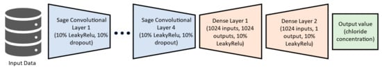 As shown in Figure 6, the spatiotemporal data are fed to the first SAGE convolutional layer using 10% Leaky ReLu as the activation layer and a 10% dropout rate. The convolution process is repeated four times, identifying and extracting relevant structure patterns in the data. After that, the processed data are passed to a sequence of two dense layers using 10% Leaky ReLu, where the forecasted chloride concentration is finally output by the model.