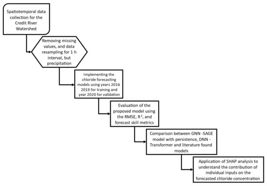 Overall, the data-driven approach shows great potential when applied to the hydrology/environment research area. However, some authors believe there is a deficiency in understanding the application of the deep learning paradigm for predicting chloride levels. To address this problem, the present work proposes to use a cutting-edge approach combining graph theory and DL to assess future chloride concentrations based on spatiotemporal data for the Credit River located in Ontario, Canada. This work expects to contribute to the field by carrying out the following tasks:
