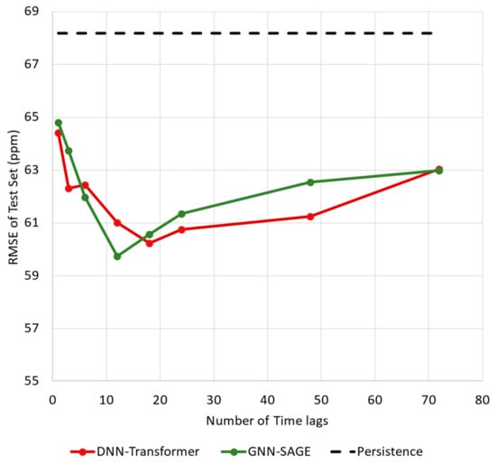 Figure 8 shows the RMSE for different numbers of time lags for the proposed DNN-Transformer and GNN-SAGE models. Increasing the time window size proved to be beneficial for the graph-based model up to 12 h. Beyond that threshold, the results started to deteriorate. For the DNN-Transformer, incorporating past information enhanced the model’s performance for up to 18 h, where more time lag values started to harm the model’s performance.