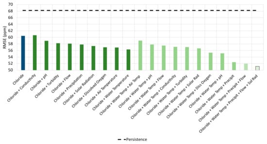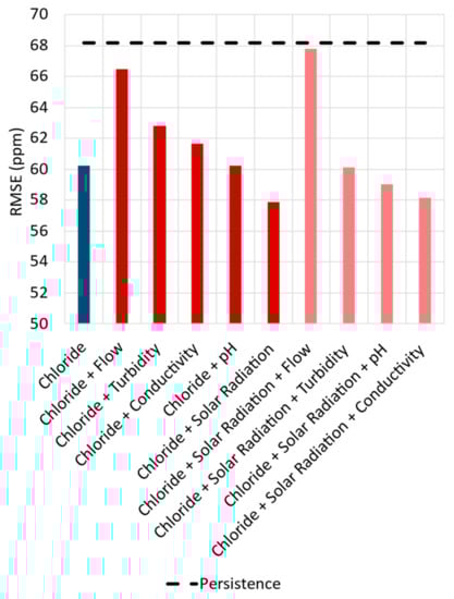 As shown in Figure 11, the model’s forecasting ability improved with the inclusion of additional variables. For this case, the best solution was reached using chloride, water temperature, precipitation, flow, and solar radiation, resulting in an RMSE of 51.16 ppm.