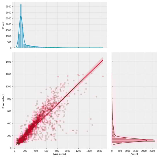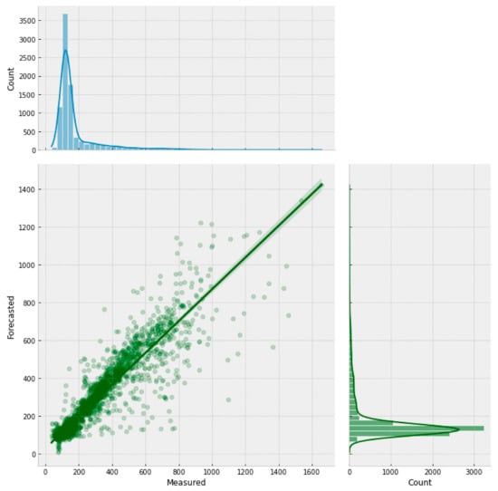 Figure 10 presents a scatter plot for the transformer model and the marginal distributions for the actual and forecasted concentration values. The graph shows good agreement between the measured and actual chloride values, as evidenced the clustered points around the regression line, which reached a coefficient of determination of 82%, and by both marginal distributions having similar distributions. The DNN-Transformer model reached an RMSE value of 57.86 ppm and an MBE of −1.97 ppm, suggesting a slight underestimation of the forecasted values.