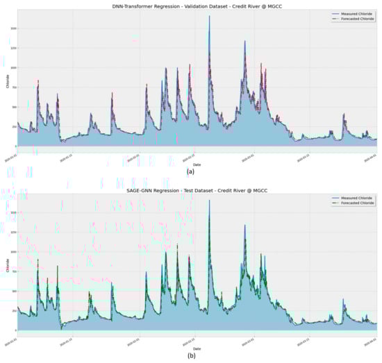 The GNN-SAGE approach also reduced the lag between the forecasted and actual measured chloride concentrations, a common phenomenon in time series forecasting as larger forecasting windows require more data [59,60,61]. The narrowing of this prediction gap is fundamental for providing more accurate and precise future chloride concentrations, allowing for better decision-making and policy development by stakeholders and environmental agencies.