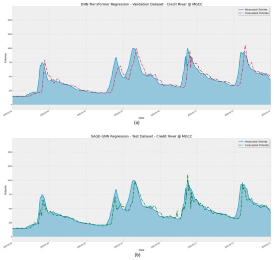 The GNN-SAGE model proposed in this research has proven to be a reliable tool for estimating future chloride concentrations in the Credit River. Based on graph theory and deep learning, its structure can satisfactorily identify and extract complex spatiotemporal dependencies in data collected from the neighboring stations. Its superior performance for time series applications has been well documented in the literature, where this approach consistently produces state-of-the-art results with respect to forecasting [42,43]. The same behavior was observed in the present work, where the GNN-SAGE paradigm outperformed both persistence and DNN-Transformer models, achieving RMSE and R2 values of 51.16 ppb and 0.88, a substantial improvement over the other assessed models.