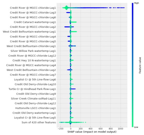 In Figure 15, it is possible to state that data from the reference station “Credit River @ MGCC” make a major contribution to the determination of the chloride concentration. Figure 15 also shows that the top three most influential variables for the model’s forecasting are the chloride concentrations from the reference station. Moreover, the SHAP results show that neighboring stations contribute to the model’s output. These stations provided important information regarding water temperature, which is the fourth most influential attribute; solar radiation, which may provide seasonality information; and flow. This states the importance of spatiotemporal information coming from the surroundings of the reference station in improving the model’s forecasting [41,42,43,62].