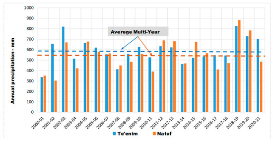 Annual precipitation in the study period varied from a maximum of 827 mm in 2002 to a minimum of 336 mm in 2000 in the Te’enim catchment basin, and from a maximum of 883 mm in 2018 to a minimum of 303 mm in 2001 in the Natuf catchment basin. During the study period, no tendency toward decreasing annual precipitation was found. The high variability in the annual precipitation values is obvious. Maximal and minimal annual precipitation values differ by 2.9 times. The average annual rainfall is 591 mm in the Te’enim basin and 551 mm in the Natuf basin (