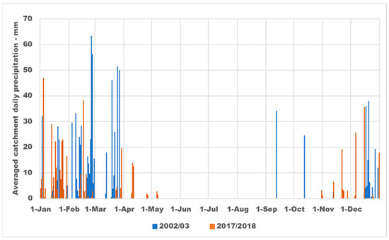 28]. Rainfall starts in October and ends in May. Daily precipitation over the Natuf catchment for the 2002 hydrological year with the maximum value of annual rainfall for the 2017 hydrological year and the average annual value are shown in