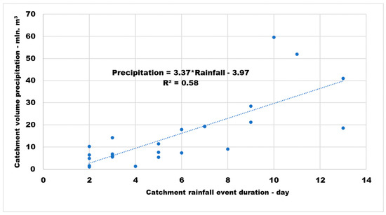 Precipitation volumes over the catchment area from 1–2 to 10–14 million m3 are typical for rainfall event durations of less than 3 days. For rainfall event durations from 4 to 10 days in nearly 50% of rainfall events, the precipitation volume varied from 15 to 30 million m3. At rainfall event durations of more than 10 days, the precipitation volume reached 60 million m3.