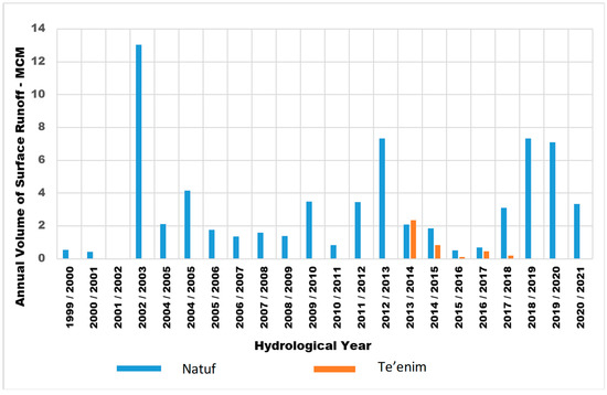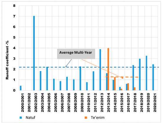 Figure 11. The average multiyear surface runoff coefficient equals 2.03% for the Natuf catchment basin and 1.27% for the Te’enim basin. For the Te’enim catchment basin during the 2013–2018 period, it seldom exceeded 1%, and only during 2013 did it reach 4%. For the Natuf catchment basin, the annual surface runoff coefficient usually varied from 1% to 2%, and only in 2002 did it reach 7% with the highest recorded precipitation amount (827 mm). In recent years, from 2018 to 2021, the annual precipitation was above average, reaching 800 mm (