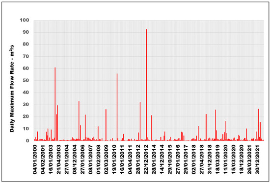 17]. The daily maximum flow rate of surface runoff from the Natuf catchment area, measured at the El Al Junction hydrological station during the 2000–2022 hydrological years, varies from 0.02 to 92 m