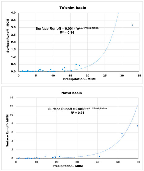 3 for the Natuf catchment basin (12.1 mm). The correlation between the volumes of precipitation and the surface runoff is described by exponential dependencies with a squared correlation coefficient ranging from 0.92 to 0.96 (