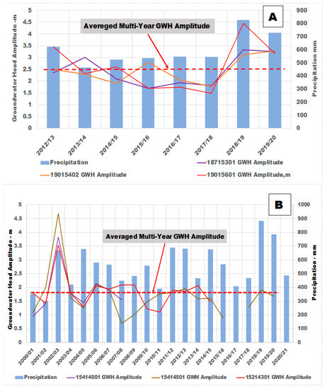 Figure 13). In the Te’enim catchment basin, the annual groundwater head amplitude varied from 1.5 m to 4.5 m during the monitoring period of 2012–2020, with the maximal groundwater level head of 4.5 m occurring in the hydrological year of 2018. The average multiannual groundwater head amplitude for the Te’enim basin was 2.5 m (